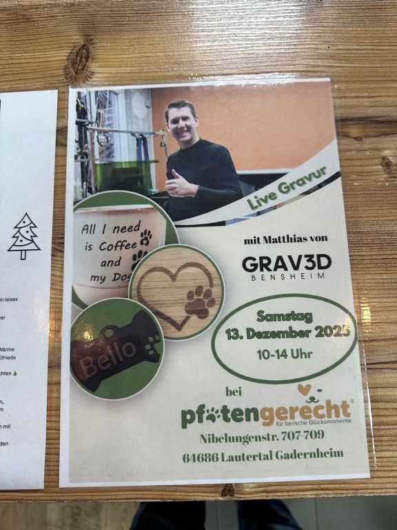 ✨ Tipp am Rande: Wer Pfotengerecht persönlich kennenlernen möchte oder noch ein besonderes Geschenk sucht, kann am Samstag, den 13. Dezember 2025, vorbeischauen. Von 10–14 Uhr gibt es dort eine Live-Gravur mit Matthias von GRAV3D – liebevolle, individuelle Anhänger für eure Vierbeiner. 🐾❤️ Vorbeischauen lohnt sich! 🤗